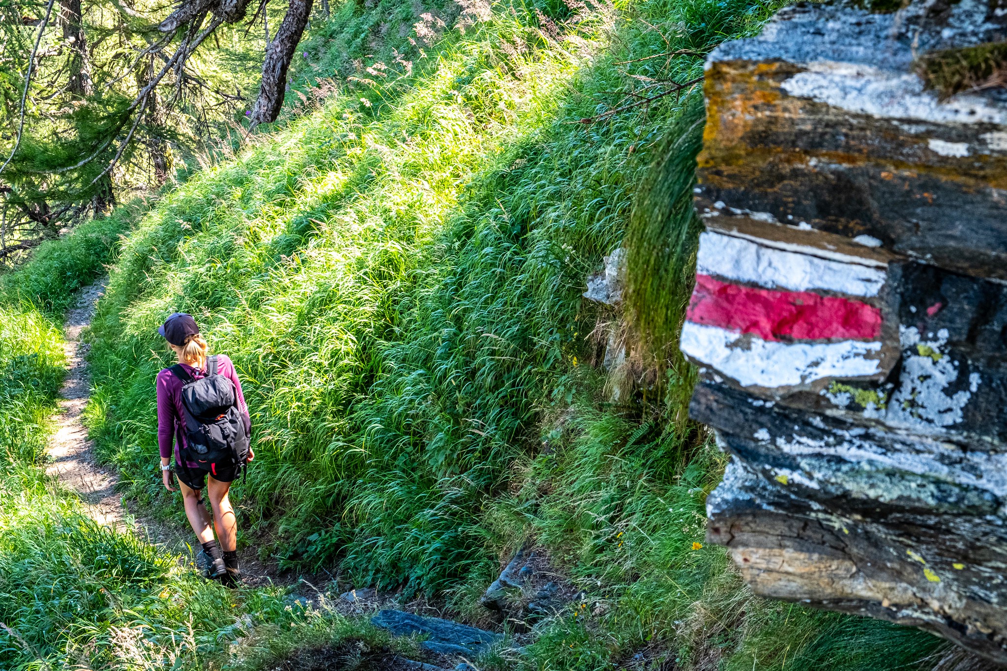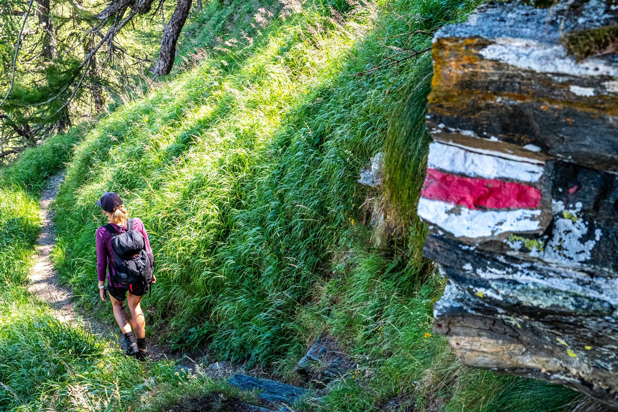 Nicht jeder schätzt die wilde Gondoschlucht: Wenn du Höhenangst verspürst oder mit Hunden wanderst, die nicht über Gitter laufen können, wählst du lieber diese Etappen-Variante des Stockalperwegs. Die Route führt dich dabei zwar ebenfalls von Simplon Dorf Richtung Gondo, der Weg zweigt jedoch beim Weiler «Gabi» ab und steigt in engen Serpentinen Richtung «Furggu» auf.