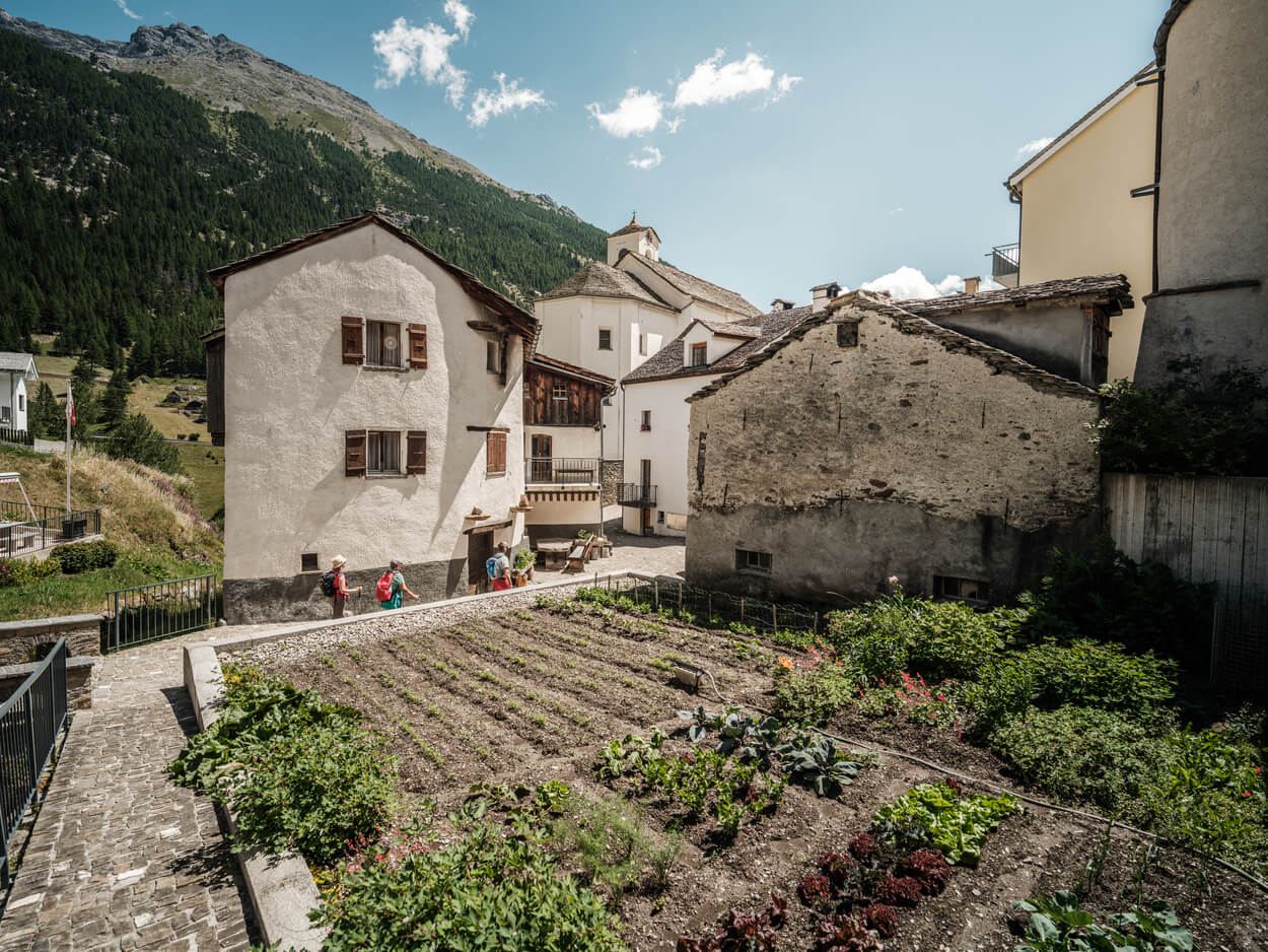 In Simplon Dorf angekommen, kannst du im Hotel einchecken und auf den Gartenterrassen entspannen. Um dir noch etwas die Füsse zu vertreten bietet sich der Dorfrundgang an. Flyer mit Informationen zum Dorf findest du vor Ort. zum Rundgang